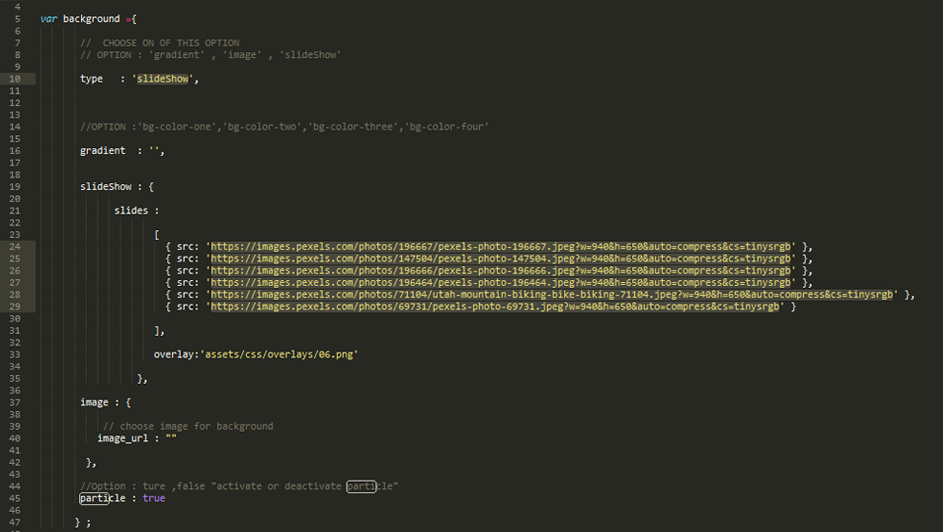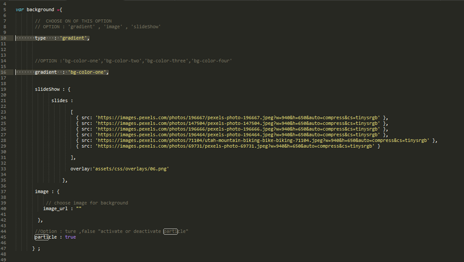 - for background type : "slideShow" fill slides paths :"" with your images paths